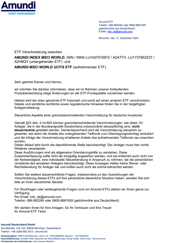 In den vergangenen Jahren kam es beispielsweise häufig vor, dass Anbieter ethisch-ökologische Auswahlkriterien ergänzt haben. Das war auch bei ETF oft der Fall. Ebenfalls beobachten wir, dass ETF den Indexanbieter wechseln oder er ändert die investierte Währung. Damit ergeben sich unter Umständen andere Risiken für dein Portfolio. Amundi gab als Beispiel in diesem Fall an, dass die Verschmelzung der fortlaufenden Produktentwicklung geschuldet ist.