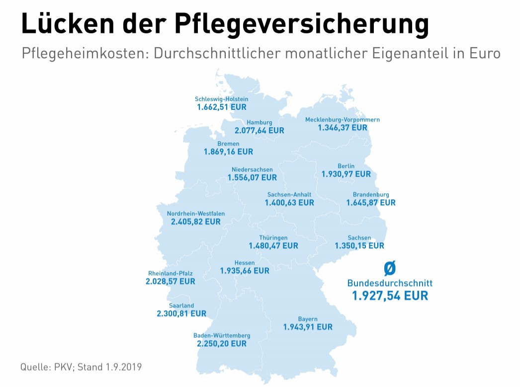 Wie jede soziale Absicherung stemmt die gesetzliche Pflegepflichtversicherung lediglich einen Teil der tatsächlichen Aufwendungen. In Baden-Württemberg zahlt ein Pflegebedürftiger durchschnittlich 2.250€ mtl. zu seinen Pflegekosten dazu.